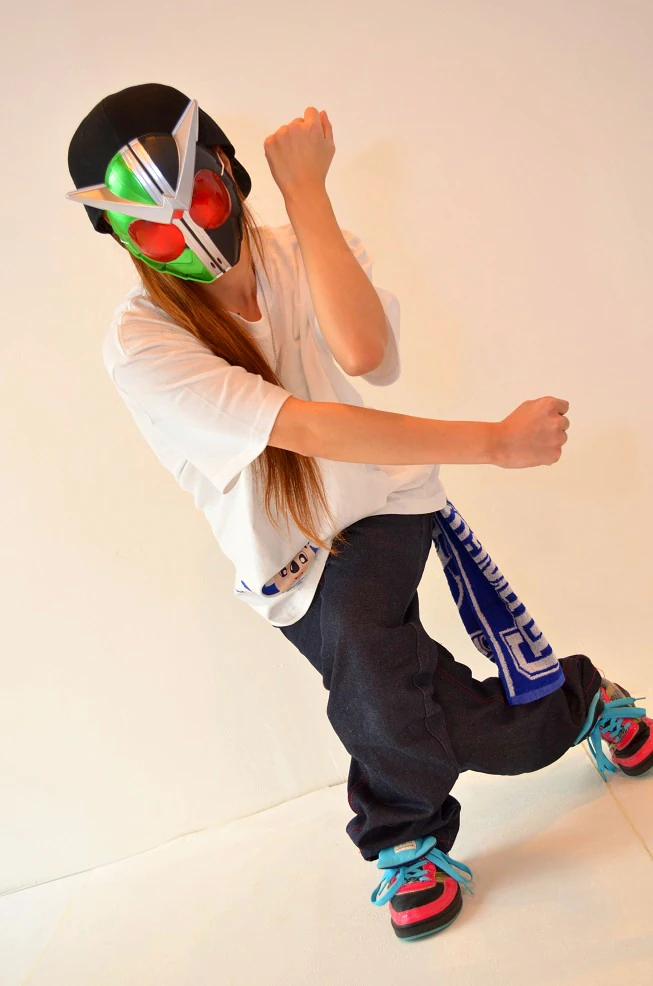 DO@RAT (ドアラット) is an odorite known for wearing a Kamen Rider Double mask (from the Kamen Rider W series)[1] and a hat atop it. She also wears a big shirt along with baggy pants to complete her hip-hop getup. She only dance to hip-hop and breakdance songs as opposed to cutesy or idol songs which are the usual choice for female odorite.